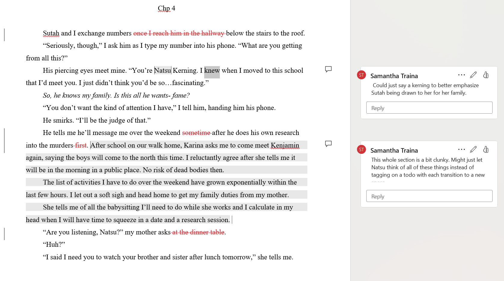 This is the in depth look at your manuscript. Here I would check for spelling and grammar along with clarity and consistency of your word choice. I also am looking over your manuscript for flow and general format of the text.